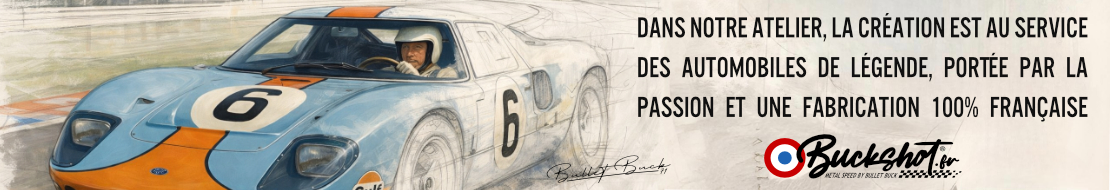 Les plaques métalliques Buckshot sont fabriquées en France, pensées pour durer et pour vivre dans des lieux qui ont une âme : garages, ateliers, bars, bureaux ou intérieurs habités par la culture automobile. Chaque pièce raconte une histoire, celle d’une automobile de course devenue légende, retranscrite avec respect, précision et caractère.